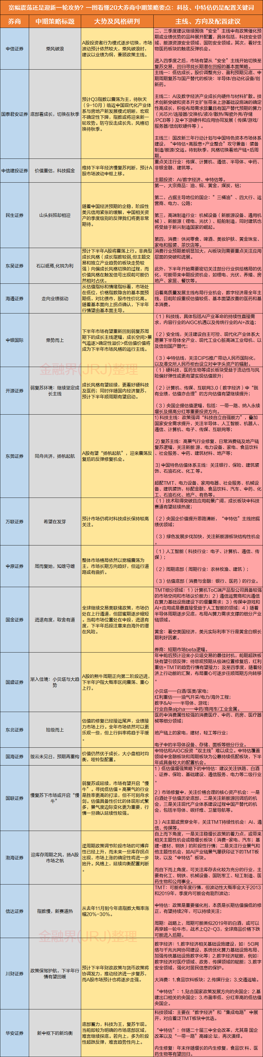 宽幅震荡还是迎来新一轮攻势?一图看懂20大券商中期策略要点:科技、中特估仍是配置关键词
