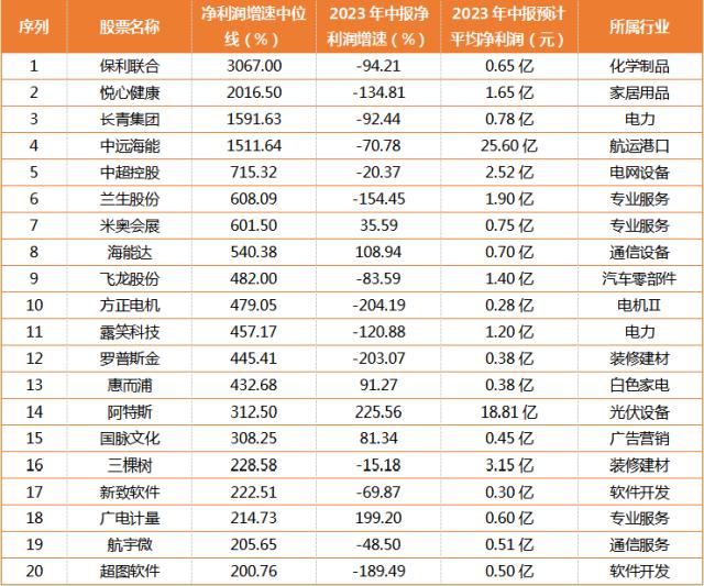 保利联合之外,悦心健康、长青集团归母净利润增速中值排列第2、3位,分别为2016.50%和1591.63%。中远海能、方正电机等在内的20家企业,归母净利润增速中值在200%以上,位居市场前20名。