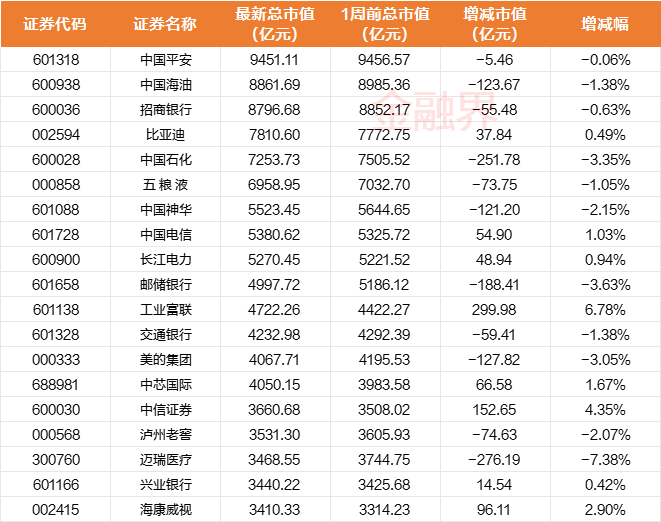 从市值增幅来看(即周涨幅),前五名分别为海光信息、中际旭创、药明康德、国信证券、三花智控;总市值降幅来看(即周跌幅),前五名分别为恒瑞医药、迈瑞医疗、联影医疗、智飞生物、百济神州,凸显了医药行业的低迷市况。截至当前,千亿市值榜单中总市值TOP5为:中国平安(9451.11亿元)、中国海油(8861.69元)、招商银行(8796.68亿元)、比亚迪(7810.6亿元)、中国石化(7253.73亿元)。