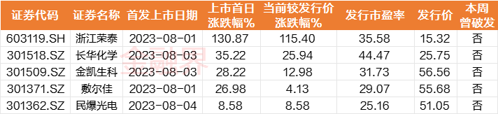 本周5只新股上市交易,目前A股共计5249家上市公司。从新股上市首日收盘涨幅表现来看,小鹏汽车供应商浙江荣泰上市首日大涨130.87%,长华化学首日涨35.22%,金凯生科、敷尔佳均涨超20%,民爆光电则小幅收涨,本周上市新股暂未遭遇破发情况。