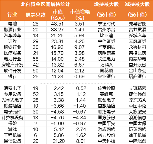 行业增仓方面,截至8月3日的近5个交易日数据显示,电池行业被北向资金净买入金额最多,达到了48.51亿元,酿酒行业紧随其后,区间获北向资金增持金额达到38.27亿元,汽车整车、证券行业增持金额超过20亿元,钢铁行业、医疗服务、电力行业、房地产开发、软件开发、银行等也较受“外资”青睐。通信设备行业被北向资金净卖出最多,本周规模达到21.2亿元,工程机械、游戏、保险遭减持规模则超过5亿元,计算机设备、电子元件、旅游酒店、光学光电子等行业净卖出额规模靠前。