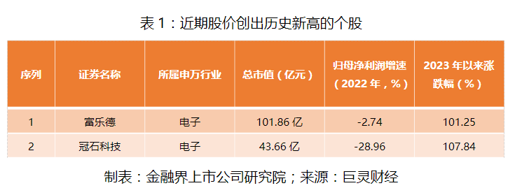 2只创历史新高个股均为电子行业,细分板块而言,分别是半导体领域的富乐德和光学光电子领域的冠石科技。市值来看,两家公司整体市值均少于150亿元,且并非沪深300和中证500上市公司。