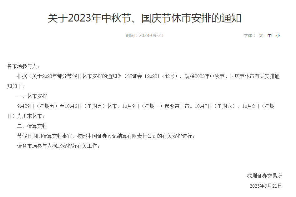 9月21日消息 沪深交易所发布2023年中秋、国庆节休市安排通知。