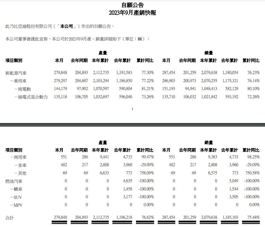 比亚迪:9月新能源汽车销量28.75万辆,去年同期20.13万辆;本年累计销量207.96万辆,同比增长76.23%。