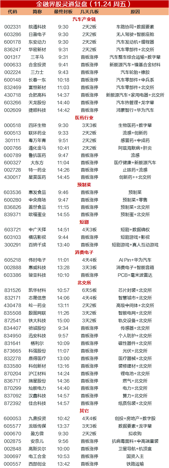 11月24日涨停复盘:马云出手,预制菜概念大涨!活跃资金急速涌入北交所,22股30CM涨停!