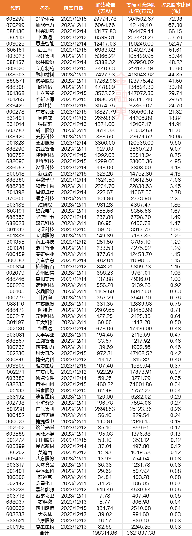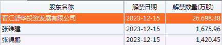 下周解禁数量最多的是舒华体育,该股将于2021年12月15日解禁6355.12万股,解禁股类型是首发原股东限售股份,解禁比例高达72.38%,解禁市值也较大,预估解禁市值达30.45亿元,解禁明细如下:
