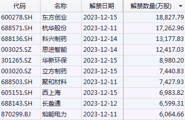 其他解禁数量较大的公司有东方创业(1.88亿股)、杭华股份(1.73亿股)、科兴制药(1.32亿股)、思进智能(1.24亿股)等。