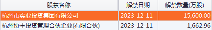 杭华股份12月1日发布限售股上市流通公告,本次上市流通的限售股股东数量为2名,持有限售股共计1.72亿股,占公司现有总股本的41.4975%,该部分限售股将于2023年12月11日起上市流通。本次解禁明细如下: