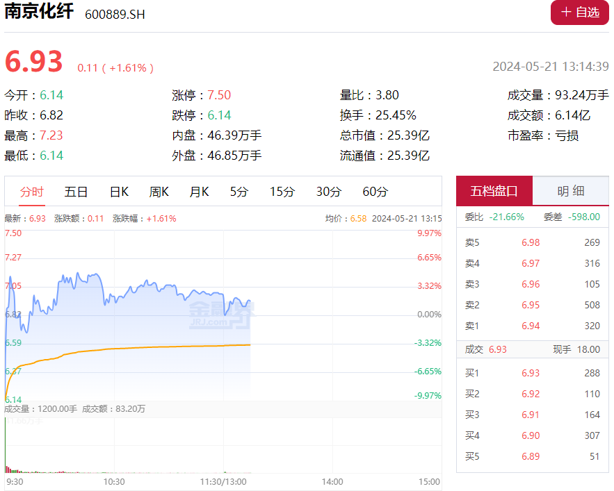 南京化纤今日跌停开盘,随后逐步走高,午间监管消息发布后曾短暂小幅跳水,截至发稿涨1.61%,报6.93元。