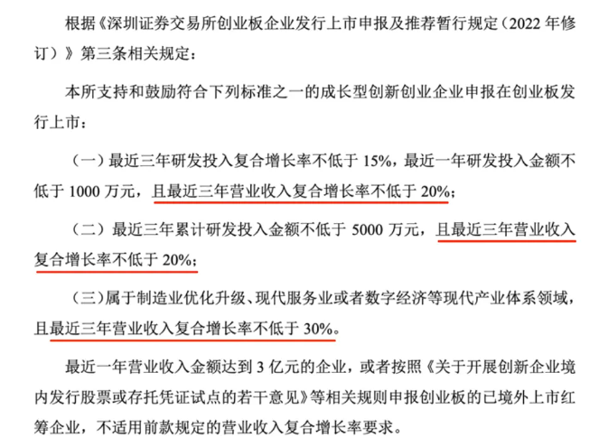但创业板也表示,最近一年营收金额达到3亿元的企业,不适用前款规定的营业收入复合增长率要求。