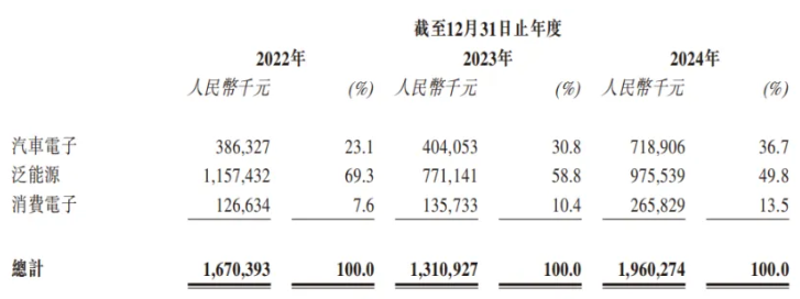 从应用领域来看,2022年至2024年,来自汽车电子领域的收入占比由23.1%提升至36.7%;来消费电子领域的收入占比也有所提升,而泛能源领域的收入占比则有所下降。