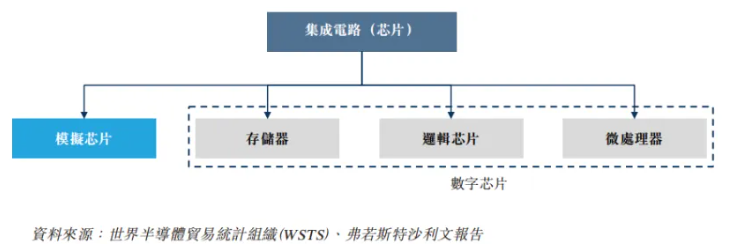 集成电路(或称芯片)可分为模拟芯片、微处理器、逻辑芯片和存储器。微处理器、逻辑芯片和存储器可统称为数字芯片。模拟芯片按2024年销售收入计约占整体集成电路市场规模的15%。