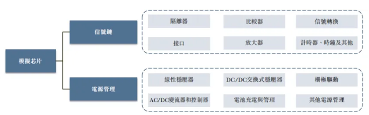 模拟芯片按照功能及产品类型的不同,主要可分为信号链芯片及电源管理芯片。