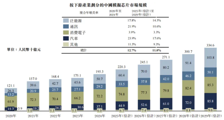 按下游产业划分的中国模拟芯片市场规模,来源:招股书