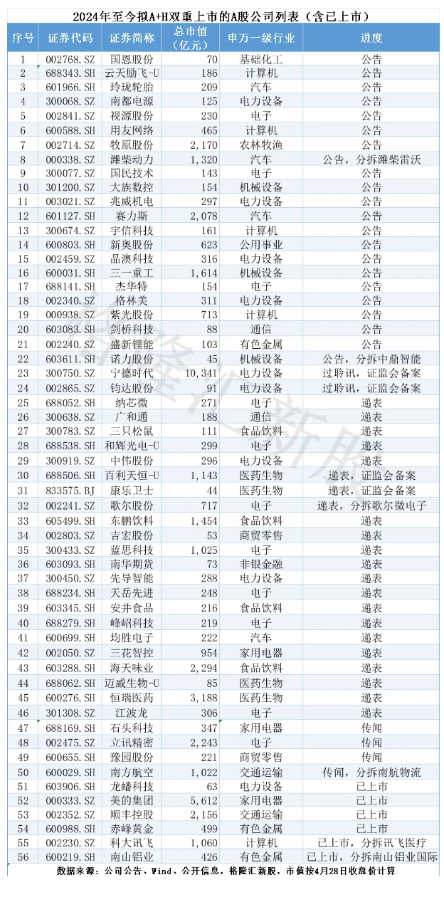 2024年以来,已有超过50家A股企业披露了拟港股IPO的计划或已提交申请(文末附拟A+H上市的公司列表)。