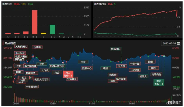 5月8日,A股主要指数低开高走,截至收盘,沪指涨0.28%报3352点,深证成指涨0.93%,创业板指涨1.65%。全市场超3800股上涨。板块方面,航天军工、CPO、通信设备、大飞机及卫星互联网等板块涨幅居前。另外,PEEK材料、贵金属、黄金板块走低。