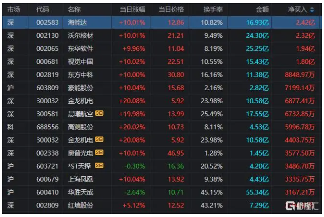 龙虎榜单日净买入额榜前三为海能达、沃尔核材、东华软件,分别为2.42亿元、2.32亿元、1.94亿元。
