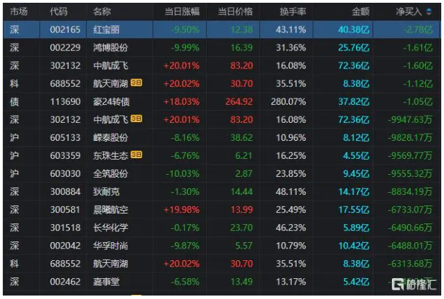 龙虎榜单日净卖出额前三为红宝丽、鸿博股份、中航成飞,分别为2.78亿元、1.61亿元、1.6亿元。