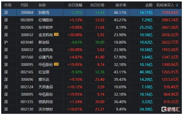 龙虎榜中涉及机构专用席位的个股中,单日净买入额前三为狄耐克、红墙股份、东华软件,分别为3594.84万元、2983.74万元、2661.58万元。