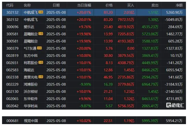 龙虎榜中涉及机构专用席位的个股中,单日净卖出额前三为中航成飞、荣泰股份、华孚时尚,分别为2.13亿元、1.74亿元、9089.67万元。