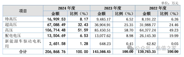 如上表,发行人产品主要应用在特高压、超高压、高压、配电电压、新能源车驱动电机用五大领域,其中高压以上的非常规输电领域的营收占比分别为89.96%、90.57%、92.19%,递增趋势明显。而在常规的配电领域,发行人的营收占比从19.99%一路暴跌至6.53%,市场份额缩水严重。至于新兴起的新能源车驱动电机用领域,对营收的实际贡献几乎可以忽略不计。