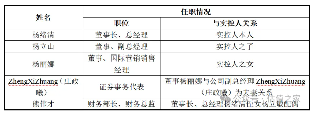 在发行人实控人享有绝对控股权的同时,在公司治理上体现出了非常明显的任人唯亲的特点。在发行人目前披露的有7名高管中,其中有多达5名系杨氏家族成员。公司董事长、总经理为杨绪清,杨立山为董事、副总经理,杨绪清的弟弟杨绪明为副总经理,杨丽娜的丈夫庄政曦担任副总经理、证券事务代表,熊伟才担任公司财务总监,而熊伟才系杨绪清侄女杨立敏的配偶。在这种情况下,发行人的人、财、物大权完全掌握在实控人家族成员手中,小股东很难对其形成有效的制约与监督。而从发行人申报期内的表现来看,发行人在日常经营过程中确实存在不少违规事项,上述担忧并非空穴来风。