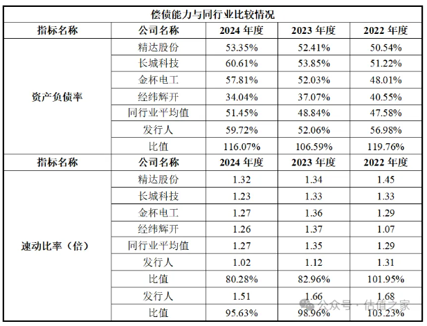 如此大规模地举债经营显然已经影响到了发行人的财务健康,申报期内公司资产负债率分别为56.98%、52.06%、59.72%,整体负债水平分别是可比公司平均水平的119.76%、106.59%、116.07%,一直稳定高于同行业公司。而在短期偿债能力方面,发行人速动比率分别仅为1.31倍、1.12倍、1.02倍,长期只有可比公司平均水平的80%。考虑到发行人经营规模长期不足可比公司的20%,偿债能力如此早衰实属不该。