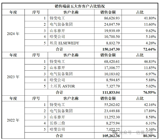 更为可怕的是,发行人在债台高筑的同时,并没有培养出足够的竞争力,供销两端的依赖程度均相当之高。销售方面,2022年度-2024年度,发行人前五大客户销售占比分别为80.30%、76.55%、72.44%,一直稳定在70%以上。发行人不仅前五大客户占比畸高,客户也非常之固定,申报内仅有7家企业入围前五大客户,其中特变电工在稳占第一大客户宝座的同时,其营收占比也一直40%以上。
