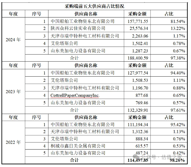 采购方面的依赖程度更是有过之而无不及。申报期内,发行人对前五大供应商的采购额占比分别为98.26%、97.61%、97.38%,采购集中度达到了令人瞠目的97%以上,其中对第一大供应商中国船舶工业物资东北有限公司的采购占比最小也有81.54%。
