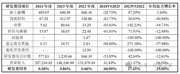 与此同时,发行人研发投入和营收变动存在非常严重的脱节情况,且各项支出变动显得相当异常。如上表,申报期内,发行人的营收实现了16.50%的增长率,而研发投入却完全相反,年均下降12.63%。而在最近的2024年度,发行人在营收实现41.84%增长的情况下,研发投入疯狂下降53.05%。很难想象,作为一家标榜自己有着较高技术影响力的企业,其营收变动和研发投入居然呈负相关,似乎过于违反商业常识。