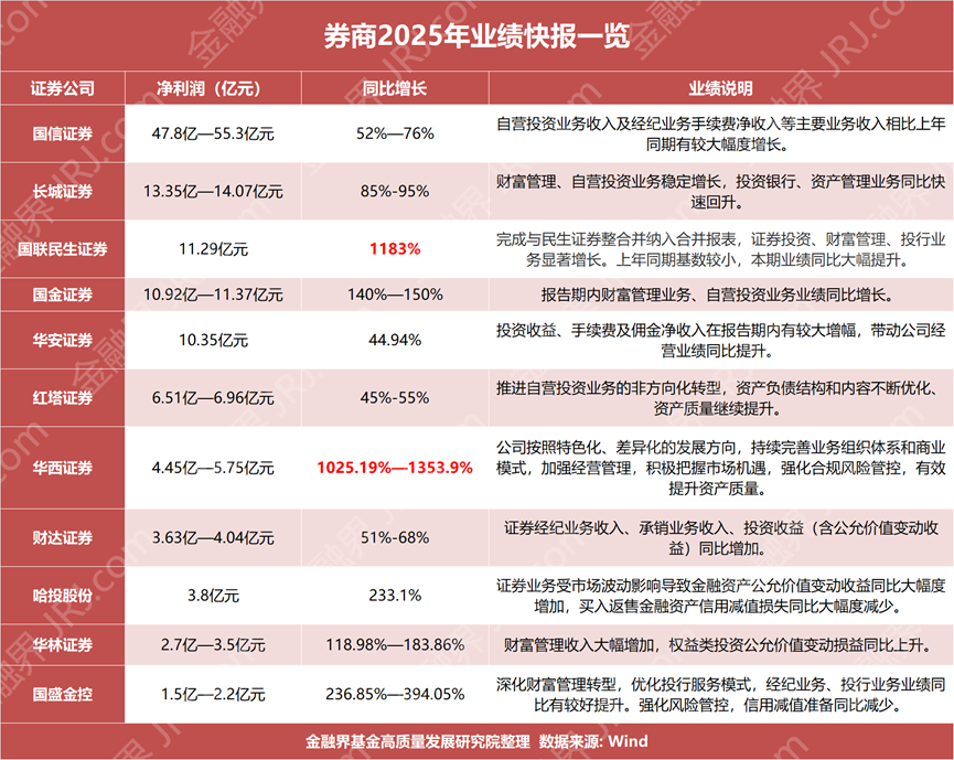 从净利润规模看,国信证券以47.8亿至55.3亿元的预计区间暂时领跑,同比增幅高达52%至76%。紧随其后,长城证券、国联民生证券、国金证券、华安证券的归母净利润预计均超10亿元大关。