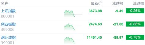 截至发稿,沪指跌0.26%,创业板指跌0.88%,深成指跌0.78%。