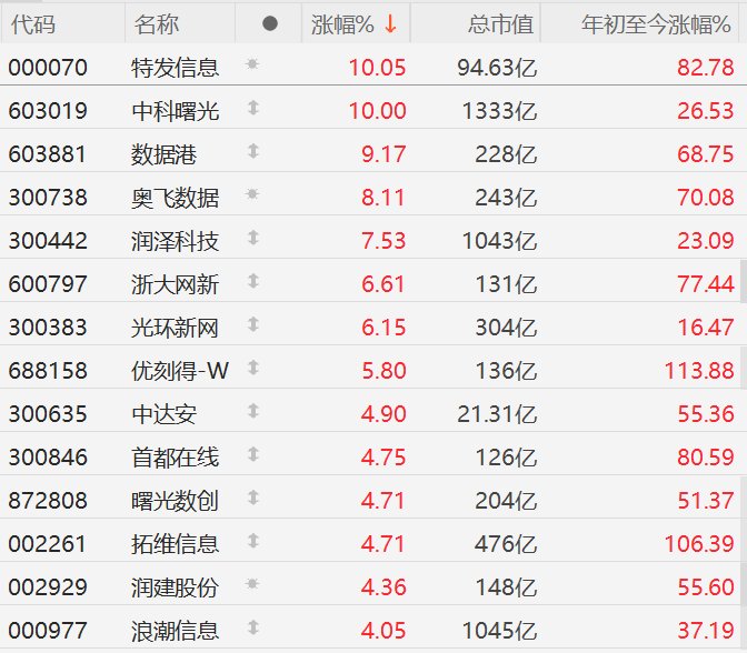 东数西算概念股集体走强,特发信息、中科曙光涨停