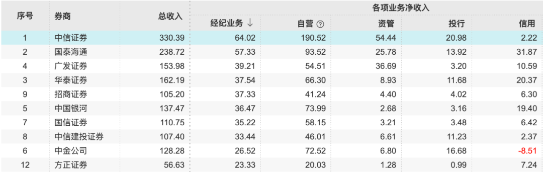 经纪业务方面,中信证券和国泰海通收入均超过50亿元,分别为64.02亿元和57.33亿元;广发证券、华泰证券、招商证券、中国银河、国信证券以及中信建投证券的经纪业务收入在30亿元至40亿元之间。