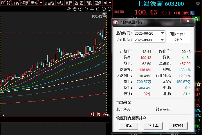 固态电池概念龙头上海洗霸强势涨停,走出二连板,报100.43元/股,涨幅达到10.00%。从阶段性表现看,上海洗霸自6月26日以来涨幅惊人,53个交易日涨幅达到136.64%,今日盘中价格100.43元正是这一轮上涨的高点。