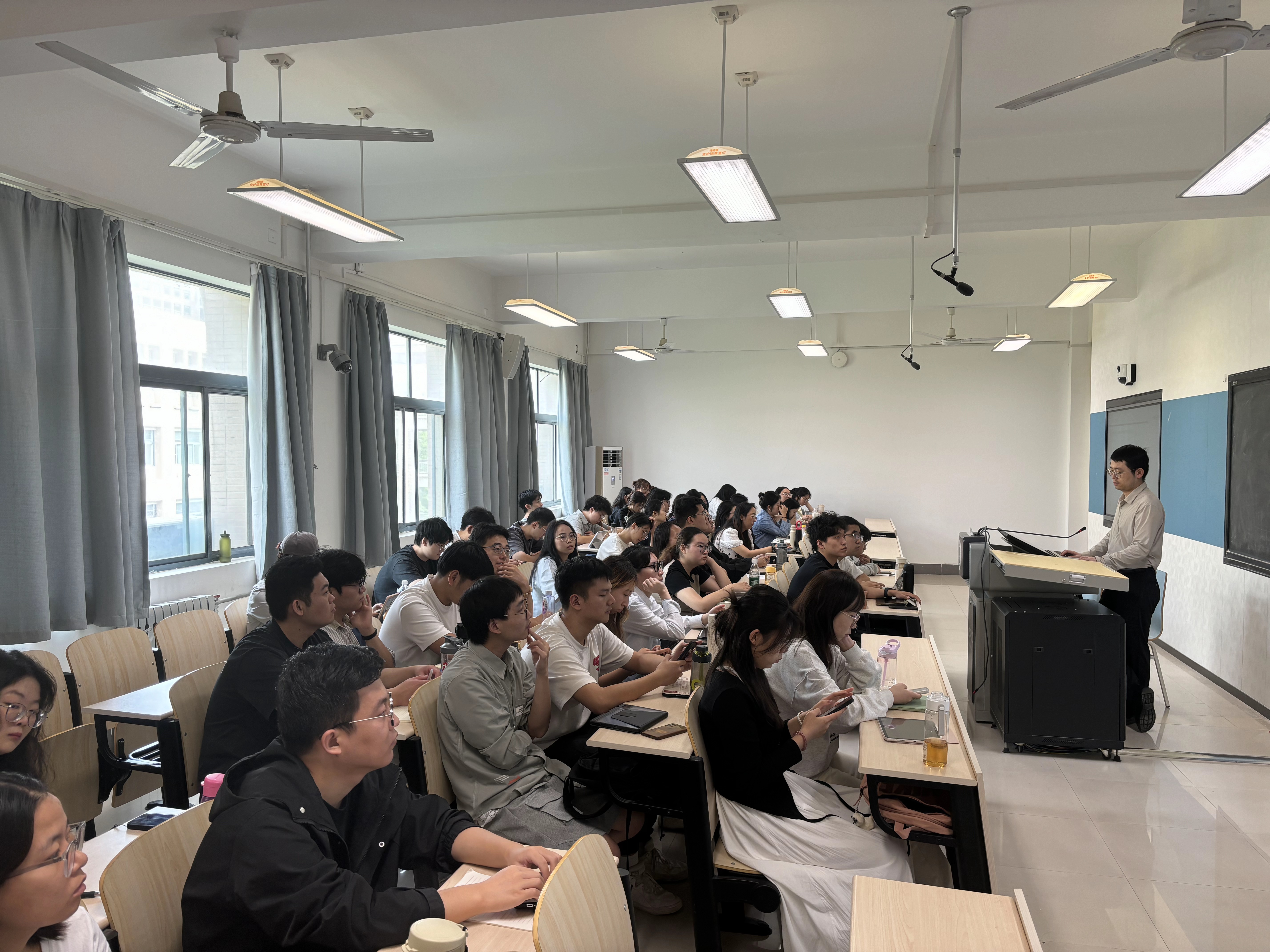 课程现场座无虚席,60名金融专业硕士带着对证券行业的探索热情投入学习。刘毅以多年证券投研实战经验为基石,围绕“权益投资实务”核心主题,从解析证券行业组织机构与投研岗位设置,复盘中国资本市场过去 30 年的发展脉络,通过“宏观经济、企业盈利、利率水平、资产比价”四位一体分析框架,解读行情波动的核心逻辑,重点阐释证券投研的日常工作内容。针对金融专业学生关切的职业发展,提出“热爱+能力匹配”的择业原则,引导学生积极学习,积累实习经历,借助行业公众号、科普文章视频等保持对市场的敏感度,并对学生提出的相关问题逐一解答,现场交流氛围热烈。