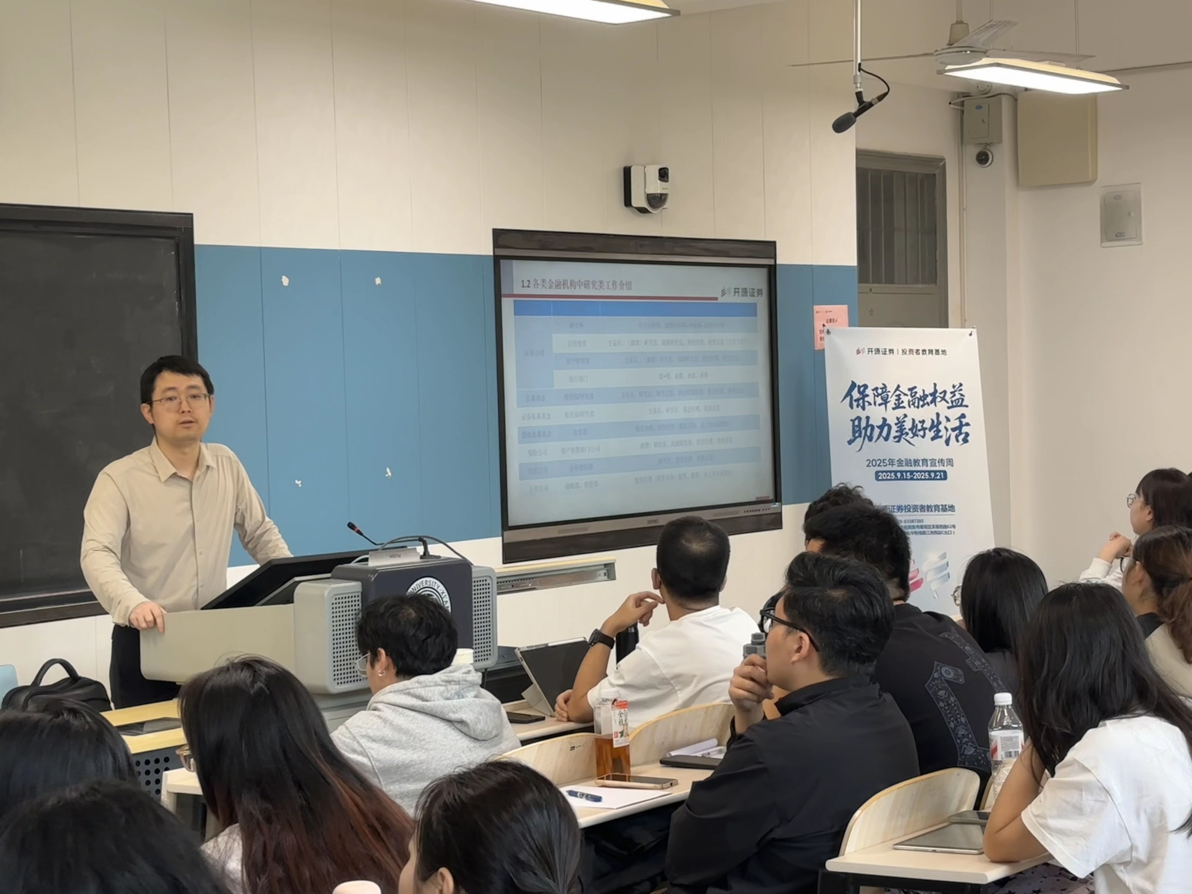 为持续推动投资者教育纳入国民教育体系,以“金融教育宣传周”活动为契机,2025年9月9日,开源证券联合西北大学共同开设的《证券市场前沿与实务》选修课程,在西北大学经济管理学院正式拉开新学年授课序幕。本次课程聚焦金融人才实践能力培养,吸引了60名金融专业硕士选修,首讲由开源证券副总经理刘毅主讲《权益投资实务》,以行业前沿视角为同学们带来沉浸式金融实务教学。