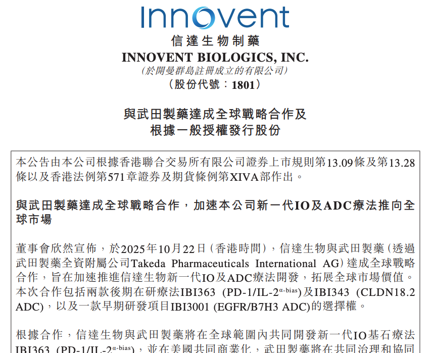 另外,就在10月22日早间,信达生物公告,公司就多款药物与武田制药达成潜在总金额最高可达114亿美元的授权交易,其中信达将获得12亿美元的首付款,包括以认购事项方式获得的1亿美元的战略股权投资,以及合计最高可达102亿美元的潜在里程碑付款,并将获得每个候选药物在大中华区以外的潜在销售分成,除IBI363在美国市场双方将采用利润损失共担模式。