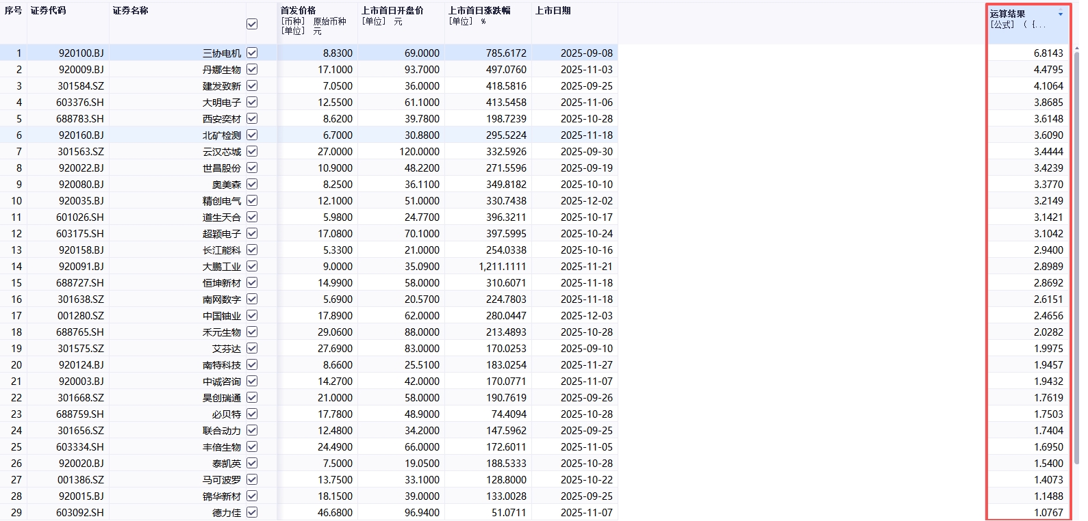 值得注意的是,此次摩尔线程上市首日遭到资金强烈关注。468%的开盘涨幅在近三个月上市新股中位列第二。近三月新股开盘涨幅榜首为9月8日上市的三协电机,其开盘较发行价大涨681%;11月3日上市的丹娜生物、9月25日上市的建发致新分别以448%、411%的开盘涨幅,位列同期新股涨幅第三、四位。