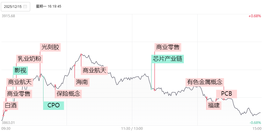 12月15日,A股三大股指低开高走冲高回落,全天整体呈现倒“V”型走势,截止收盘,沪指跌0.55%报3867.92点,深成指跌1.1%报13112.09点,创业板指跌1.77%报3137.8点,科创50指数跌2.22%报1318.91点,全市场成交额1.79万亿元,较前一交易日缩量3246亿元,超2900股下跌。