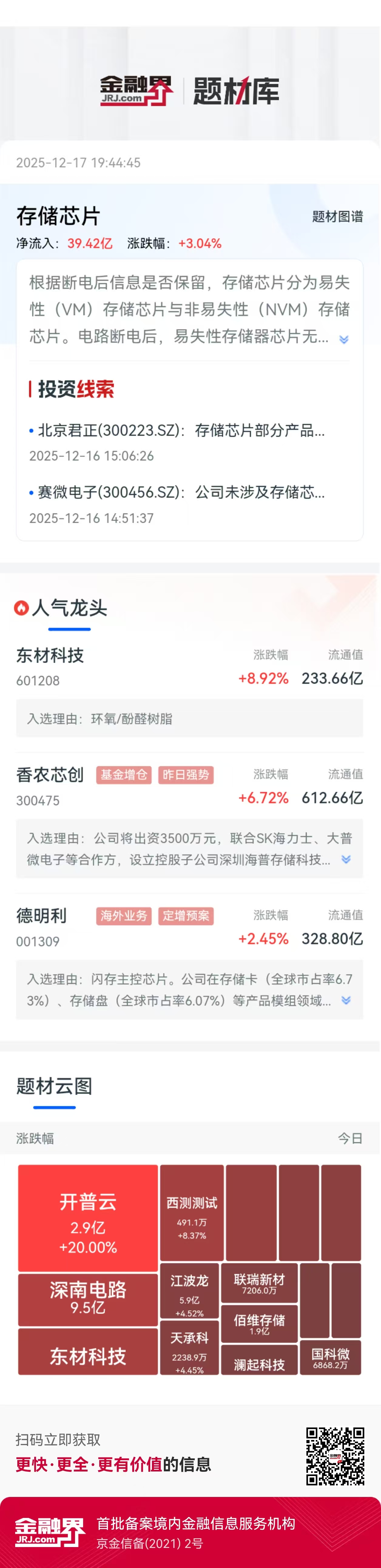 东北证券在近期发布的研报《雅克科技:前驱体材料行业领先,有望受益存储高景气》中指出,存储行业周期底部已过,受益于AI基建加速的真实需求爆发,芯片价格持续上涨。同时,国内存储芯片制造商的后续扩产预计也将带来持续的材料需求增量。中邮证券在《艾森股份:先进制程占比提升,存储领域积极推进》研报中分析认为,存储芯片领域的电镀液和光刻胶需求量随着HBM、3D NAND等存储技术迭代与产能扩张持续攀升,公司在国内头部存储客户的技术交流与产品验证持续推进,有望持续受益于国产替代趋势。