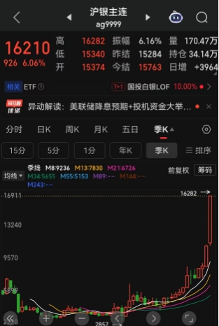 值得注意的是,在连续多日大涨之后,今日上期所白银期货主力合约再次大幅上涨,成功突破16000元/千克大关,截至收盘白银期货主力报16210元/千克,大涨6.06%。自今年以来,上期所白银期货主力合约从7470元/千克一路上扬,年内涨幅已经达到117%,这一涨幅比黄金还要夸张。