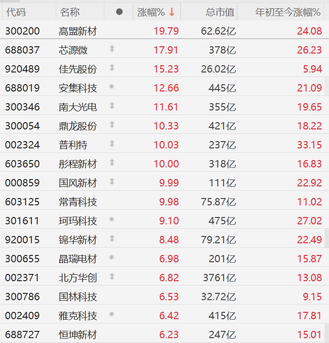 A股市场光刻机概念股集体大涨,其中,高盟新材逼近20CM涨停,芯源微涨近18%,佳先股份涨超15%,安集科技涨超12%,南大光电涨超11%,鼎龙股份涨超10%,普利特、彤程新材、国风新材、常青科技10CM涨停,珂玛科技涨超9%,锦华新材涨超8%,晶瑞电材、北方华创、国林科技、雅克科技、恒坤新材涨超6%。消息面上,隔夜美股市场光刻机龙头阿斯麦再创历史新高。