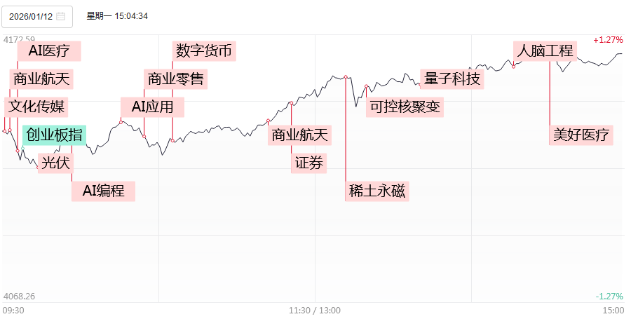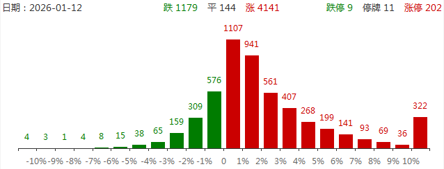 1月12日,市场震荡拉升,三大指数均涨超1%,创业板指探底回升,此前一度跌超1%。截止收盘,沪指涨1.09%,收报4165.29点;深证成指涨1.75%,收报14366.91点;创业板指涨1.82%,收报3388.34点。沪深两市成交额3.6万亿,连续第2个交易日突破3万亿,较上一个交易日放量4787亿,刷新此前在2024年10月8日创下的成交额历史纪录。盘面上,市场热点轮番活跃,全市场超4100只个股上涨,其中197只个股涨停。