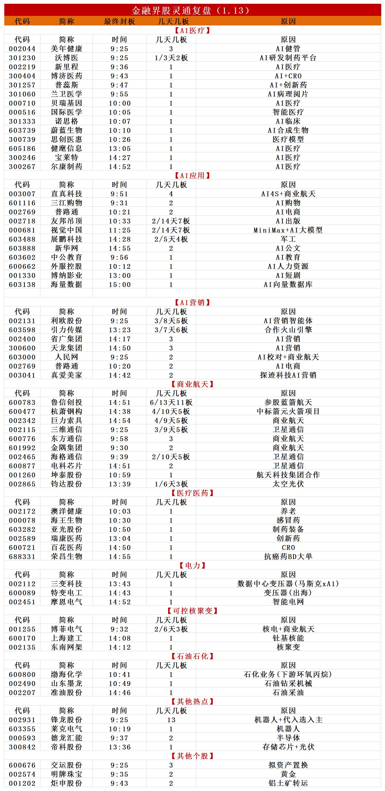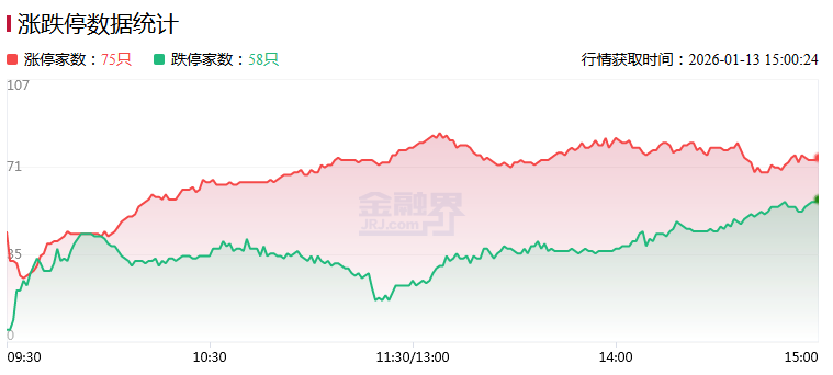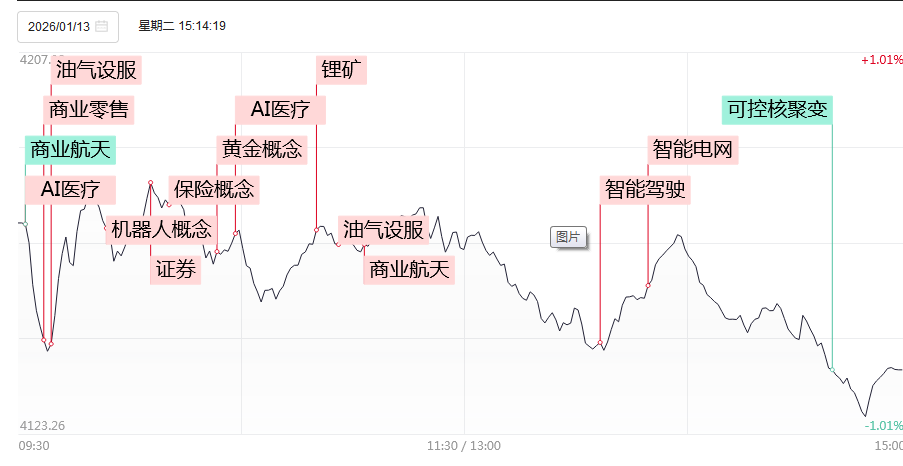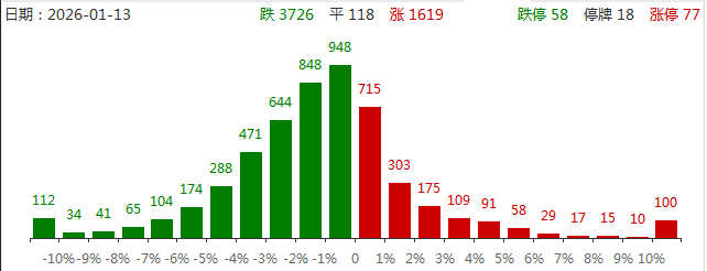 1月13日,三大指数集体调整,深成指跌超1%,创业板指冲高回落跌近2%。沪深两市成交额3.65万亿,较上一个交易日放量496亿,再创历史天量。盘面上,全市场75只个股涨停,但超3700只个股下跌。从板块来看,AI应用概念逆势上涨,十余只成分股涨停,引力传媒、利欧股份、省广集团涨停。AI医疗概念反复活跃,美年健康3连板,泓博医药、新赣江等多股涨停。电网设备概念午后走强,特变电工、三变科技涨停。零售概念表现活跃,三江购物2连板。下跌方面,商业航天、可控核聚变等板块跌幅居前。其中商业航天概念下挫,顺灏股份、中国卫通等多股跌停。截止收盘,沪指跌0.64%,收报4138.76点;深证成指跌1.37%,收报14169.40点;创业板指跌1.96%,收报3321.89点。