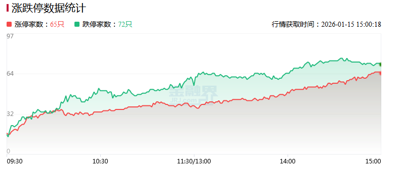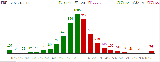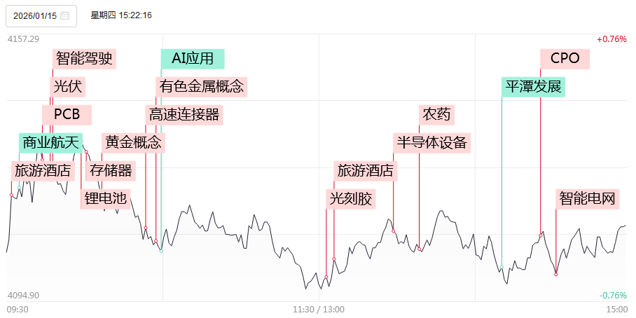 1月15日,三大指数涨跌不一,沪指盘中一度跌破4100点,创业板指午后探底回升。截止收盘,沪指跌0.33%,深证成指涨0.41%,创业板指涨0.56%。沪深京三市成交额接近三万亿,较昨日大幅缩量逾一万亿。沪深两市成交额2.91万亿,较上一个交易日缩量1.04万亿。