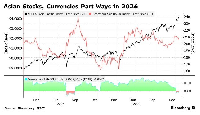 过去常同步波动的MSCI亚太指数与彭博亚洲美元指数,其30日相关性已跌破零点,为2024年9月以来首次。放眼整个地区,多国市场正出现国内股市持续创纪录上涨、而本币汇率却走弱的反常景象。