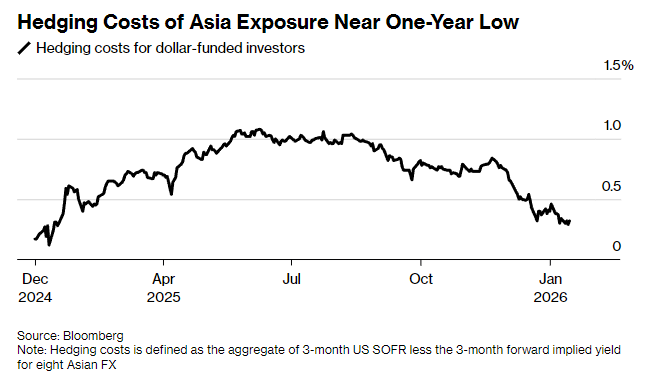 对以美元为资金来源的投资者而言,好消息是对冲成本正在下降。根据汇编的三个月远期隐含收益率数据,对冲八大主要亚洲货币的平均成本已降至0.31%,接近一年来最低水平。