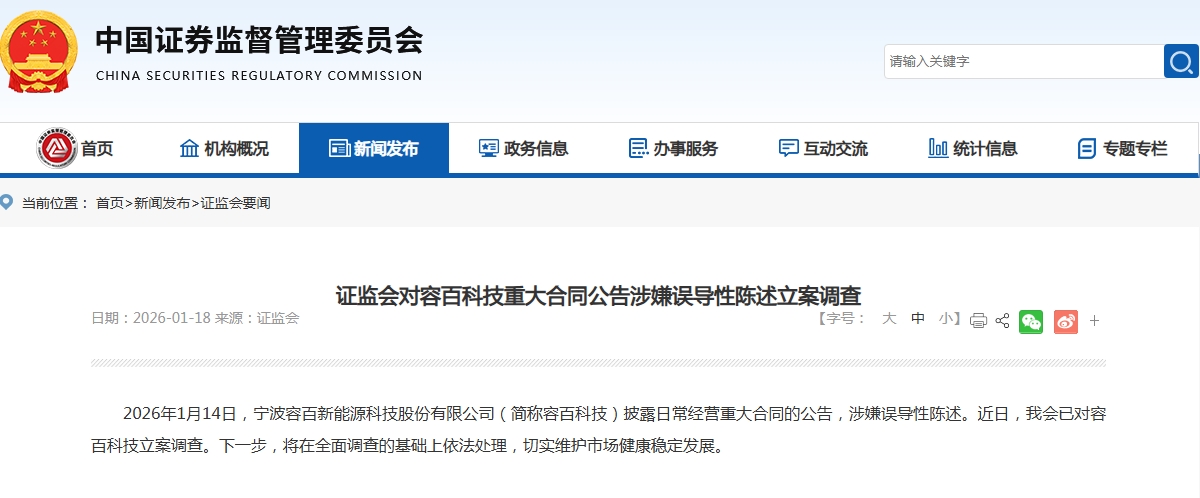 2026年1月14日,宁波容百新能源科技股份有限公司(简称容百科技)披露日常经营重大合同的公告,涉嫌误导性陈述。近日,证监会已对容百科技立案调查。下一步,将在全面调查的基础上依法处理,切实维护市场健康稳定发展。