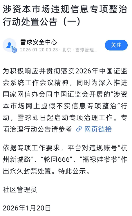 据雪球安全中心,为积极响应并贯彻落实2026年中国证监会系统工作会议精神,同时为深入推进国家网信办会同中国证监会开展的“涉资本市场网上虚假不实信息专项整治”行动,雪球1月19日起启动专项治理工作。依据专项工作要求,平台对违规账号“杭州新城路”、“轮回666”、“福禄娃爷爷”作出永久封禁处置。